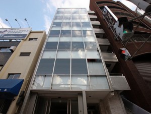 ビルの正面はガラス張りで見上げると空が映って見えます。