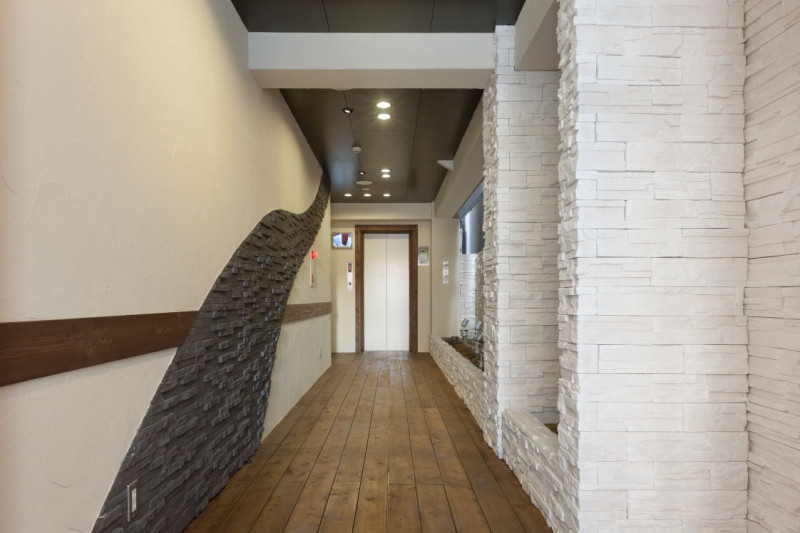 エレベーター(つきあたり)の扉の周りと床は自然を感じられるように木材を使いました。